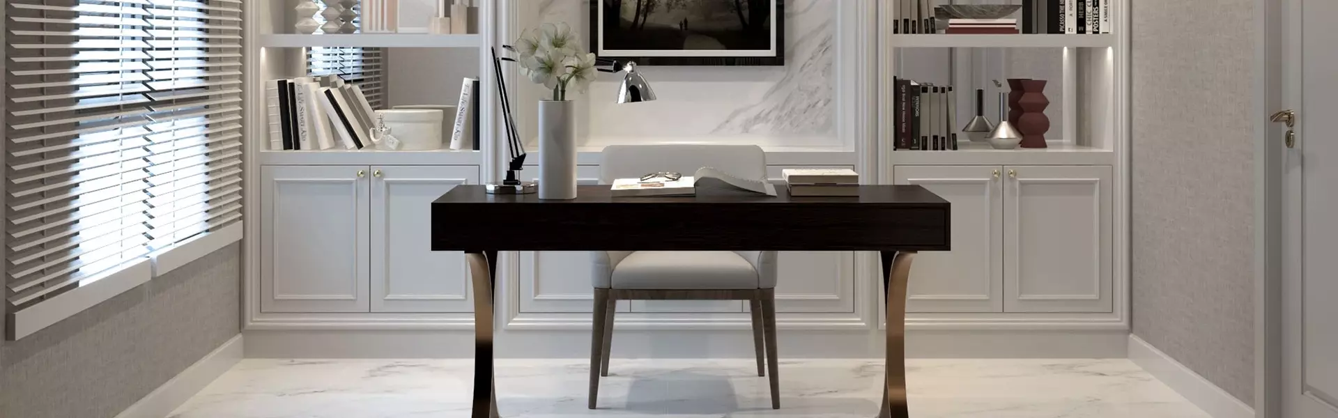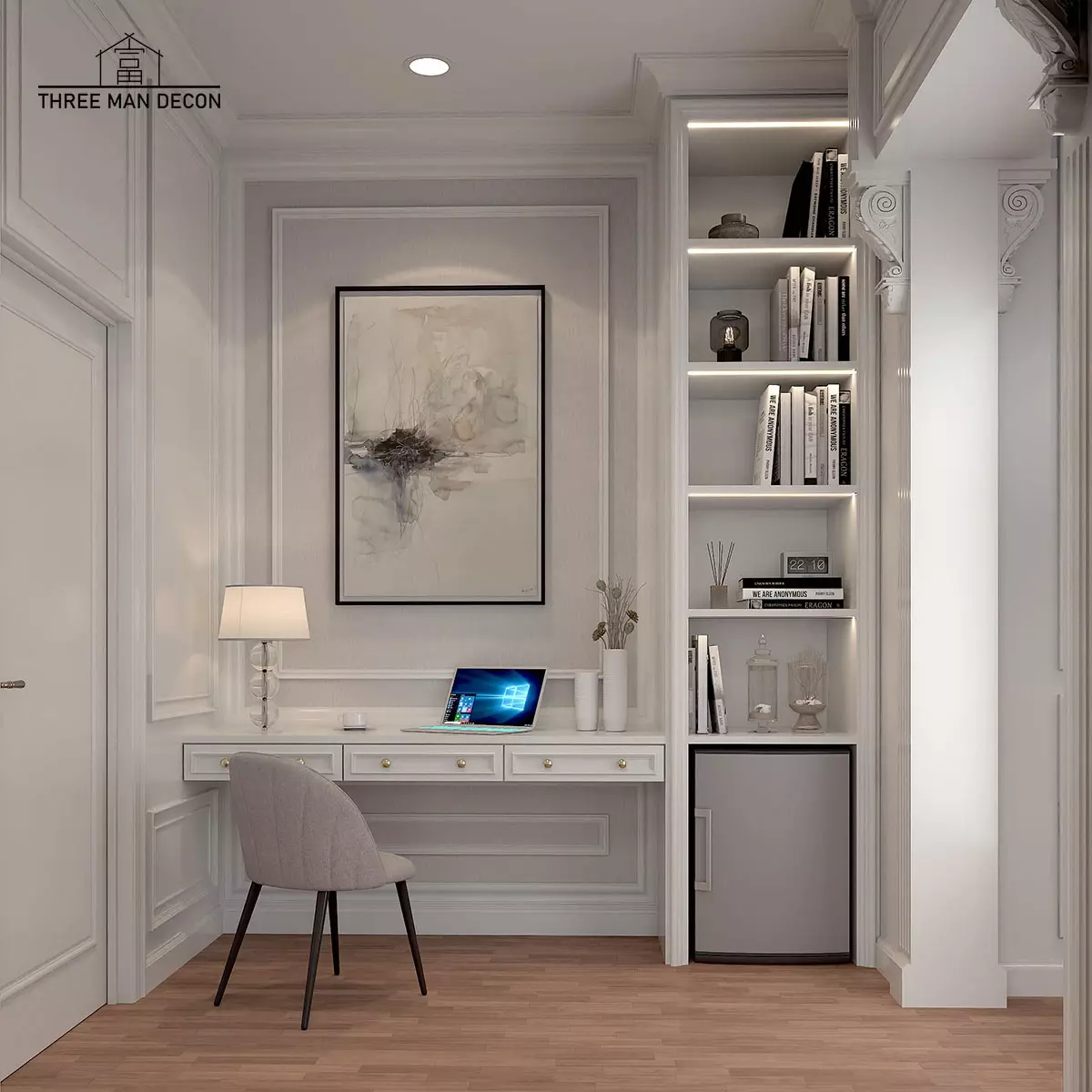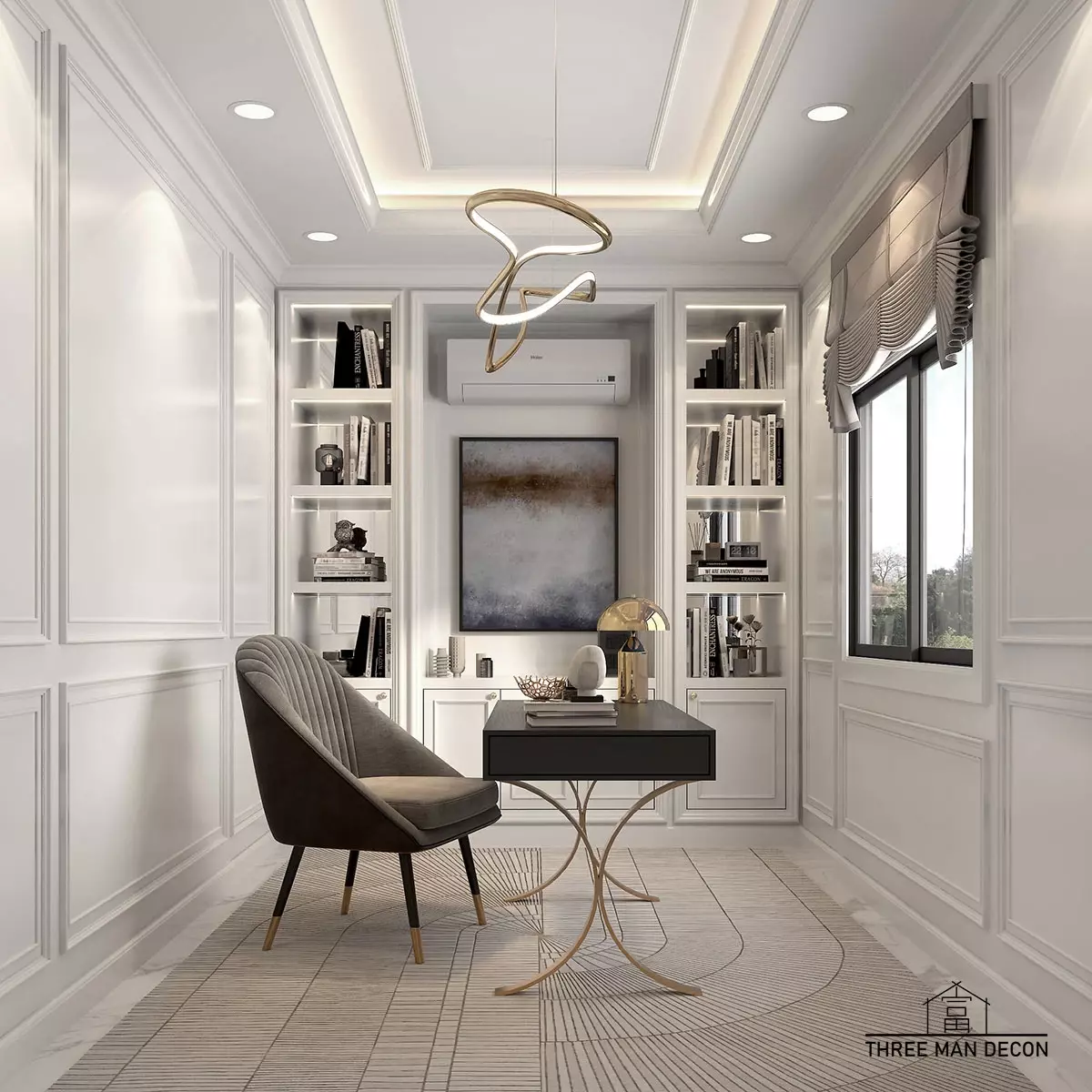 - ชั้นวางหนังสือหรือของตกแต่ง: การใช้ชั้นวางหนังสือหรือของตกแต่งที่สวยงามยังสามารถเพิ่มความสวยงามให้กับห้องทำงานได้ โดยเฉพาะห้องทำงานที่ต้องการสร้างบรรยากาศที่อบอุ่นและผ่อนคลาย